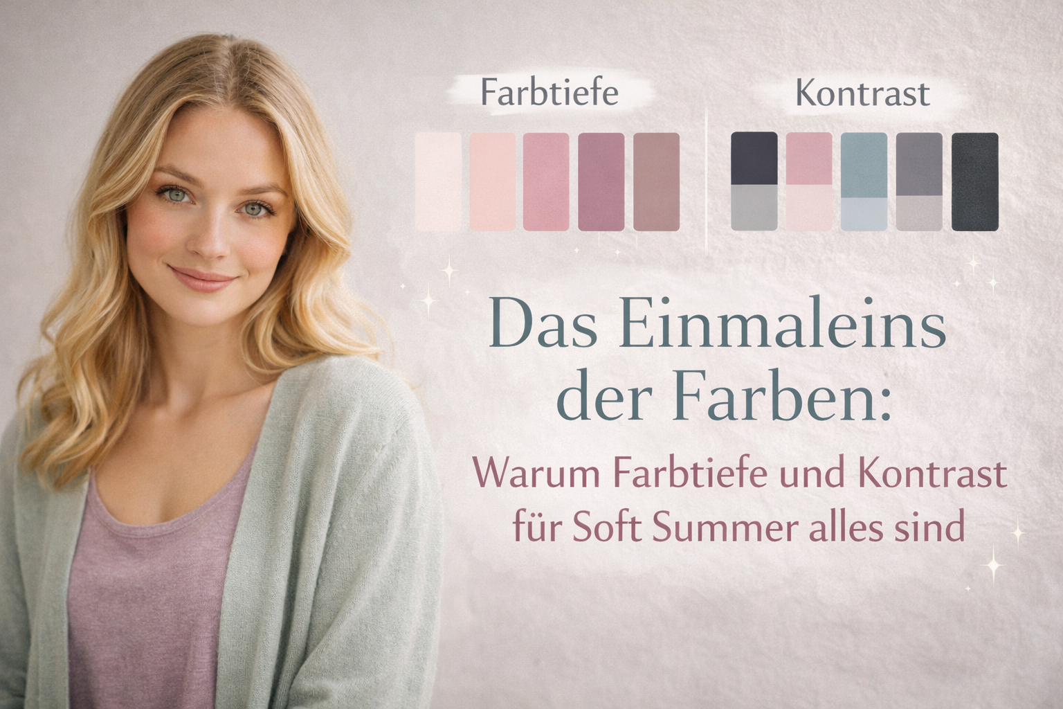 Dieser Frust beim Shoppen entsteht oft, weil wir uns nur auf die Farbe selbst konzentrieren (z. B. „Ich mag Blau“), aber die drei physikalischen Dimensionen der Farbe ignorieren: Farbtiefe, Sättigung und Kontrast. Besonders für uns Soft Summer Typen sind diese drei Begriffe das absolute Einmaleins. Wenn du sie verstehst, hörst du auf zu raten und fängst an zu wissen, warum dir etwas steht. Ich verspreche dir: Das ist der Moment, in dem die Fehlkäufe endlich aufhören.