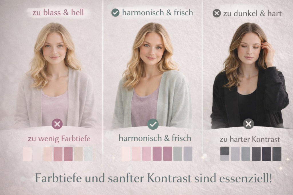 Die Farbtiefe gibt dir den Rahmen, aber die Sättigung und der Kontrast geben dir die Richtung vor. Wenn du verstehst, dass deine Stärke in der Zurückhaltung und in den sanften Übergängen liegt, wird Mode plötzlich ganz logisch.