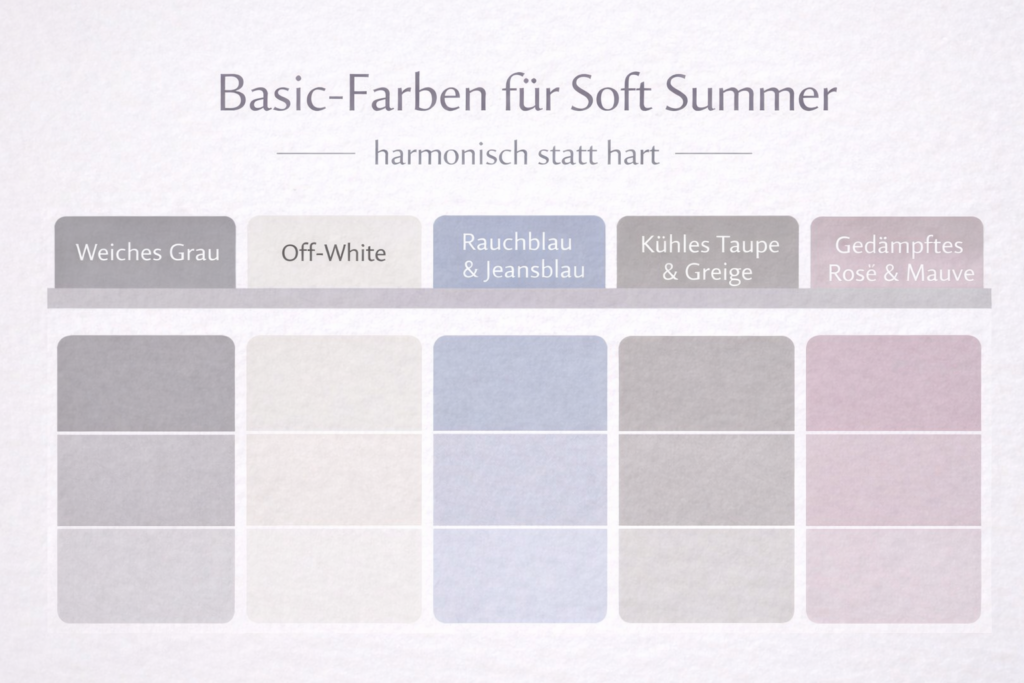 Basics wirken plötzlich zu hart, zu dunkel oder lassen das Gesicht blass erscheinen. Genau hier liegt der Schlüssel: Nicht jeder neutrale Farbton ist automatisch ein guter Basic für Soft Summer.