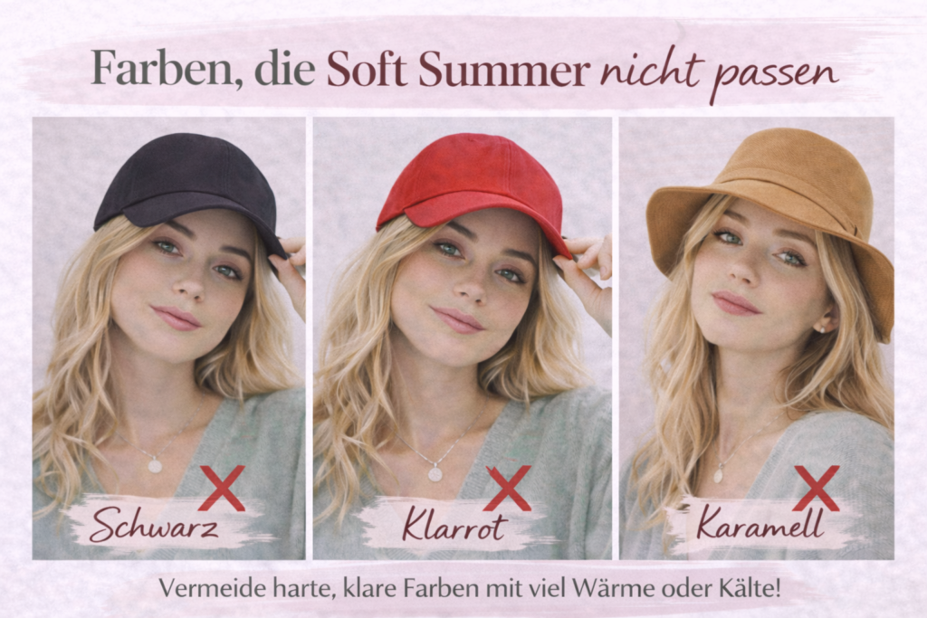 Wir alle haben gelernt, dass Schwarz und Reinweiß zu allem passen. Das ist die größte Lüge der Modewelt für uns Soft Summer Typen. Dein Farbtyp, der oft als Sommer-Herbst-Mischtyp bezeichnet wird, zeichnet sich durch seine geringen Kontraste aus. Deine Haare, Haut und Augen fließen weich ineinander. Wenn du nun ein hartes, tiefes Schwarz direkt an dein Gesicht bringst – und nichts ist näher am Gesicht als eine Cap oder ein Hut –, dann passiert der „Black Hole Effekt“. Das Schwarz ist so dominant und klar, dass es deine weichen Konturen einfach schluckt. Du wirkst darin nicht elegant, sondern eher, als würdest du zu deiner eigenen Beerdigung gehen.