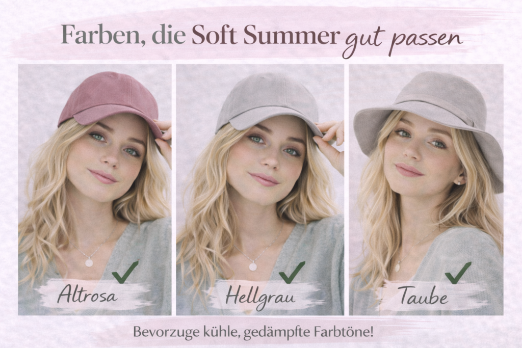Frage: Steht mir als Soft Summer eigentlich Gold- oder Silberschmuck zu meinen Hüten besser? Antwort: Da du ein kühler Typ bist, ist Silber dein Favorit. Aber weil du den Herbst als Nachbarn hast, kannst du oft auch ein sehr sanftes Gold tragen, solange es nicht zu gelb oder orangefarben ist. Wenn du unsicher bist: Roségold ist oft ein fantastischer Vermittler für Soft Summer Typen.