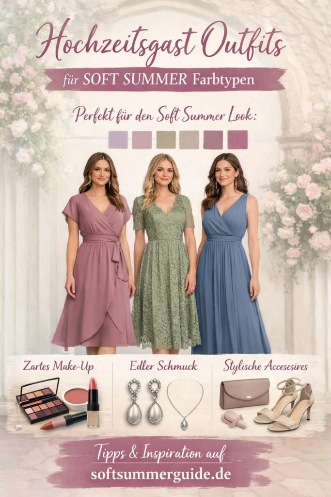 Eine Hochzeit ist der perfekte Anlass, um die sanften und eleganten Farben des Soft Summer Farbtyps zu tragen. Mit den richtigen Farben, fließenden Stoffen und passenden Accessoires entsteht ein Look, der gleichzeitig festlich, stilvoll und harmonisch wirkt.