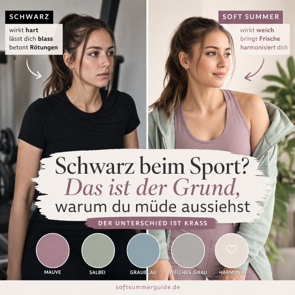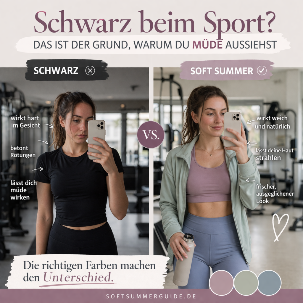 Gerade als Soft Summer passiert genau das ziemlich schnell. Schwarz ist einfach zu hart für dich. Zu dunkel, zu kontrastreich, zu weit weg von dem, was deine natürliche Ausstrahlung eigentlich ausmacht. Und beim Sport fällt das noch viel stärker auf als im Alltag, weil dein Gesicht ungeschminkt ist, deine Haut vielleicht leicht gerötet oder empfindlicher wirkt und das Licht im Gym selten schmeichelhaft ist.