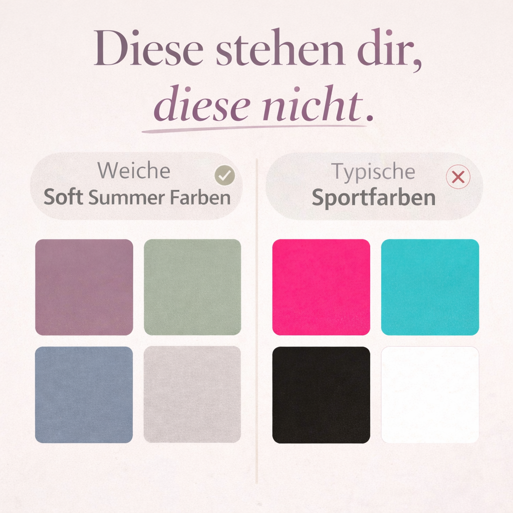 Wenn du anfängst, deine Farben zu verstehen, verändert sich dieses Gefühl komplett. Soft Summer bedeutet immer kühl, weich und gedeckt. Nichts an dir schreit nach starken Kontrasten oder knalligen Farben. Deine Ausstrahlung ist ruhig, harmonisch und genau das darf sich auch in deiner Sportkleidung widerspiegeln.
